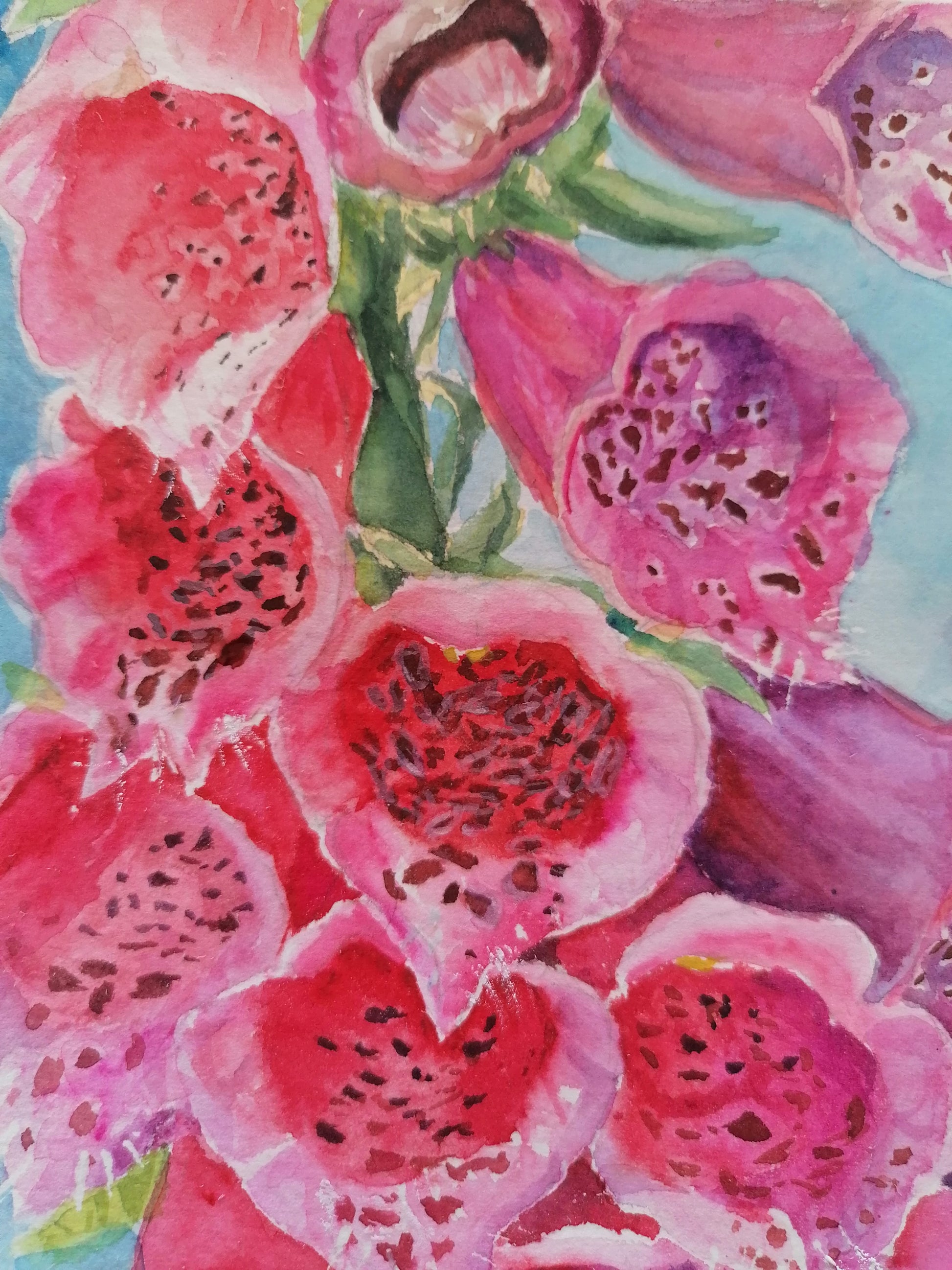 A foxglove plant had seeded itself in our bed. I just love watching the pattern on the insides. I’ve wanted to paint them for a couple of years. By chance I had a conversation with my neighbour and she asked if I was going to paint them in this series. When I said yes, she kindly sent her photos of when they were in full bloom.