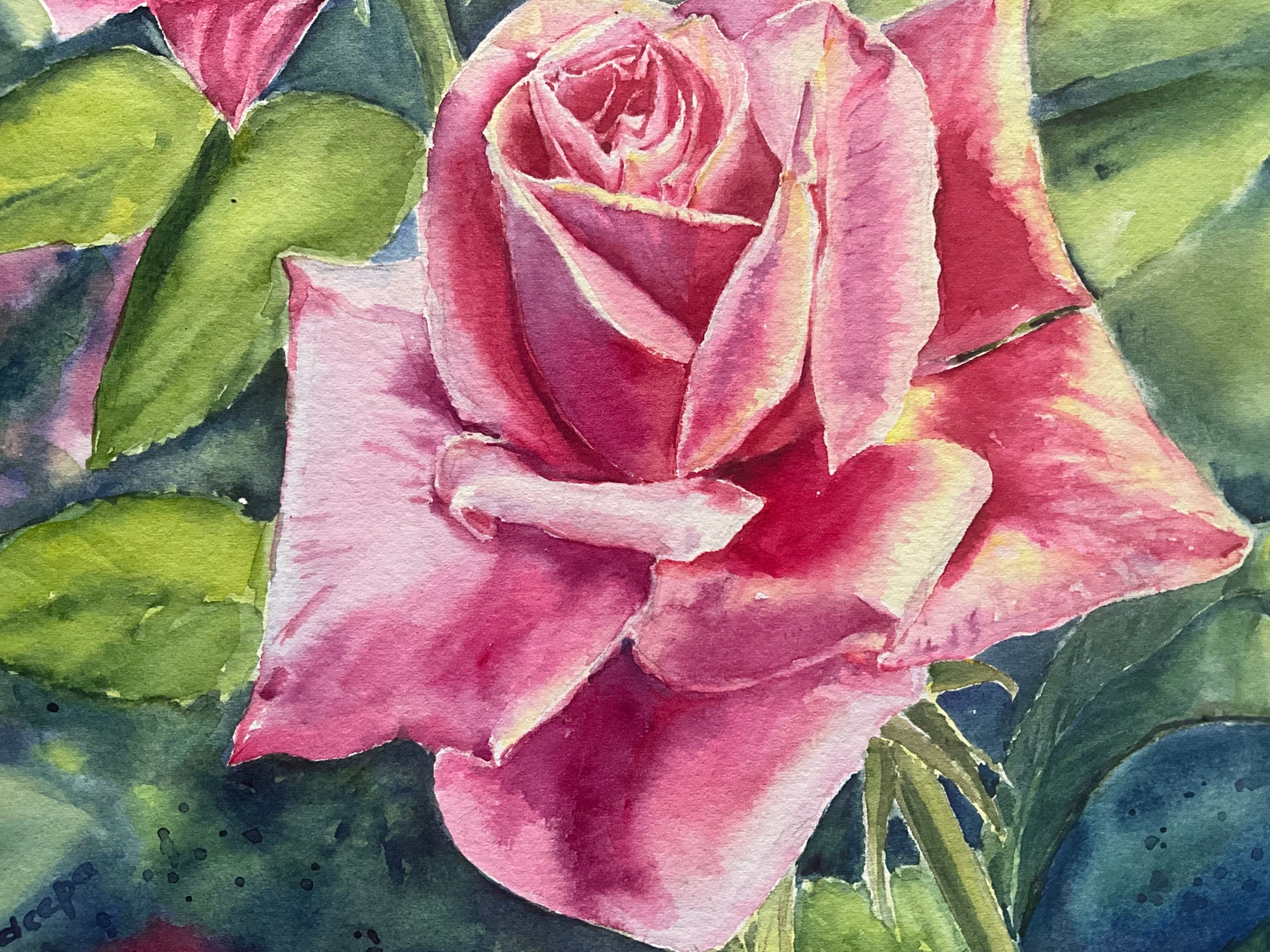 Roses have been a favourite flower of mine from when I was a child. I just love the fragrant ones. While I can’t send you the fragrance in a painting, I hope your mind will bring scented summer memories to you every time you look at this painting.